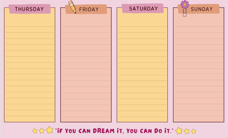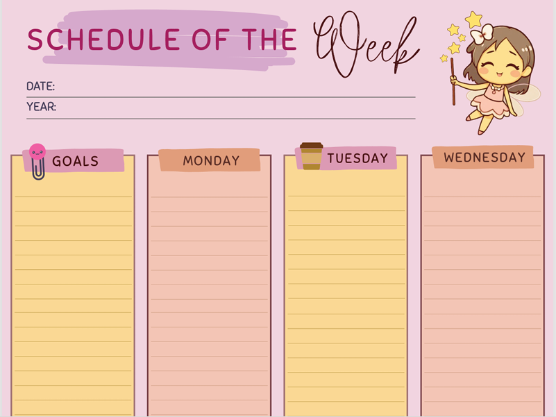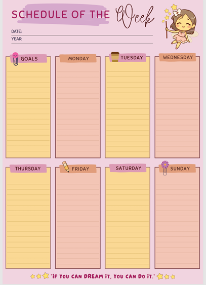 Organize your week or set daily goals with this cute kawaii fairy weekly planner.